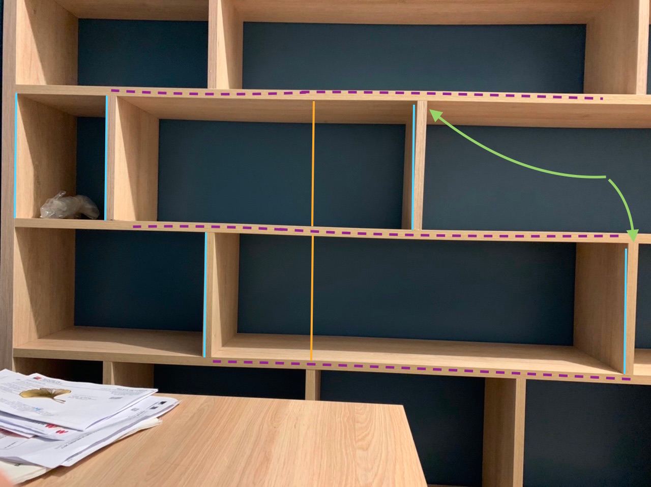 le doute est nourri par le bombé de la tablette du bas dont le montant vertical (en dessous le trait orange) est quand même très proche d'un autre montant vertical sur la tablette au dessus.