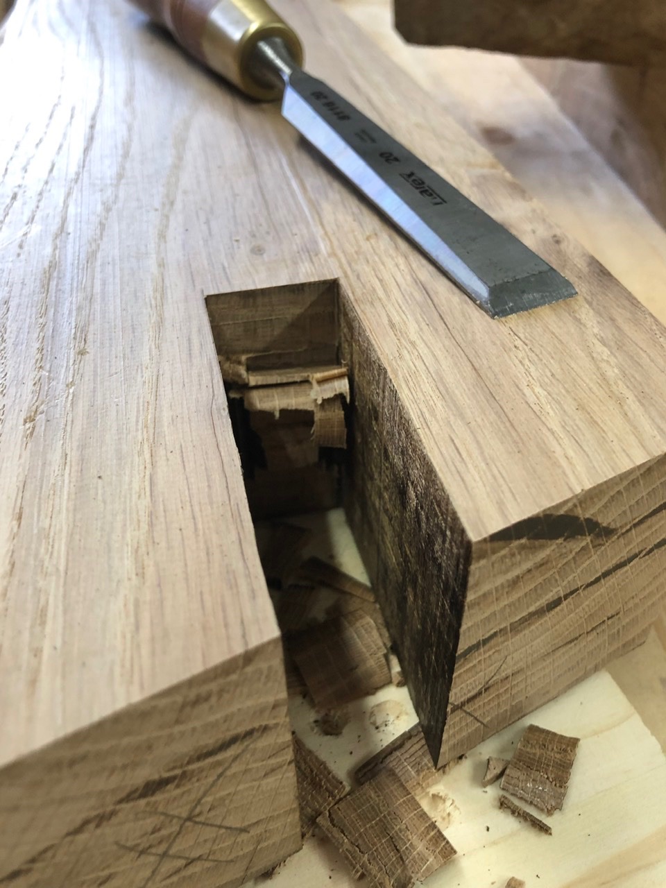 Aujourd’hui petite session finition des mortaises pour les queues d’aronde, au soleil sur ma terrasse avec mes ciseaux mon maillet et une petite mousse