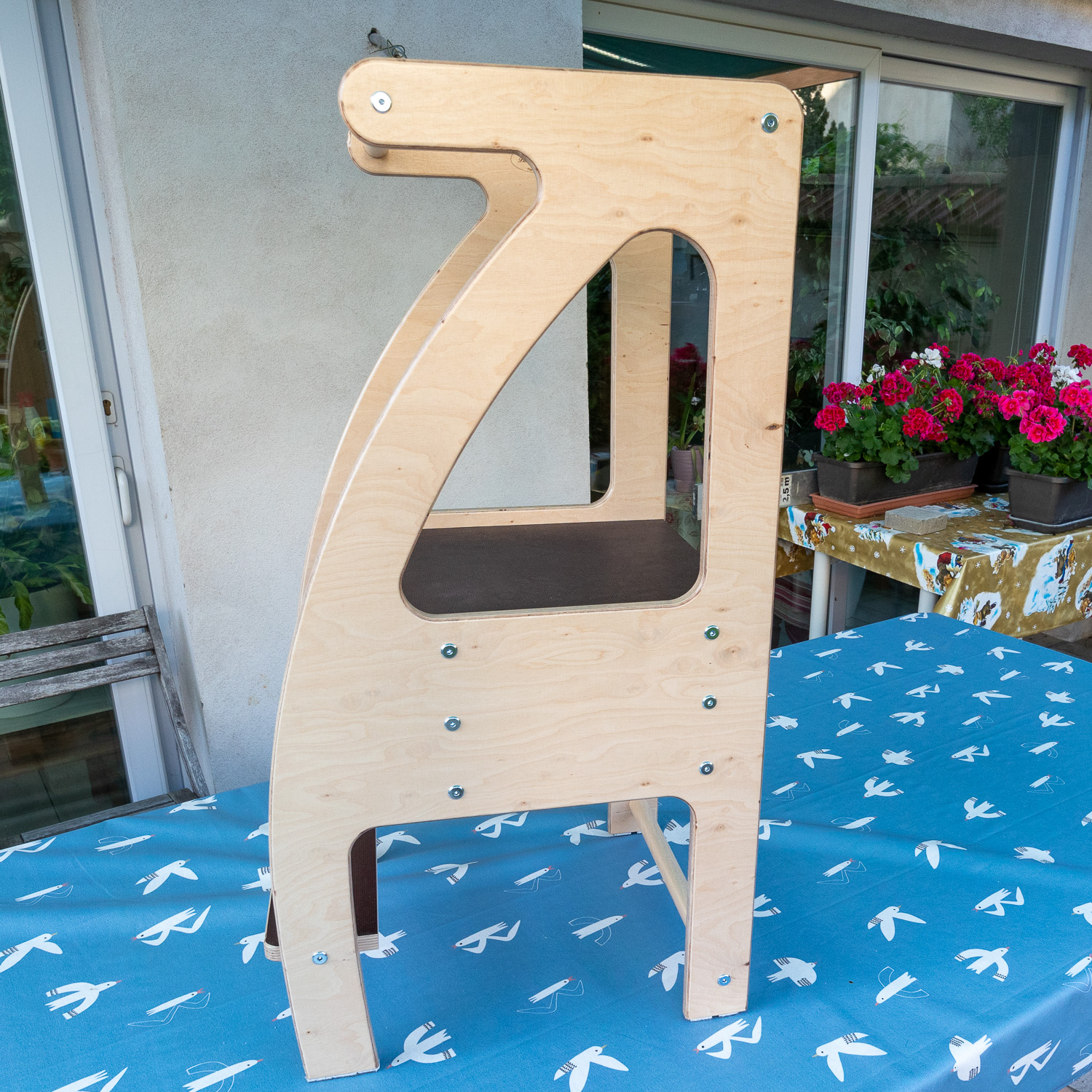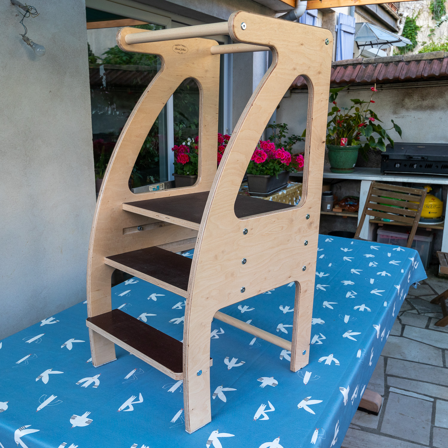 A partir du moment où le contreplaqué fait au moins 15 mm d'épaisseur, il n'y a pas de souci. Mais c'est surtout la qualité des assemblages qui va faire la solidité de la tour. S'il y a un peu de jeu, il va forcément augmenter avec l'usage, jusqu'à la rupture. Pour celle-ci, toutes les tablettes sont dans des rainures, et les ronds en hêtre rentrent en force dans un logement des panneaux latéraux. Une fois les vis serrées, plus rien ne bouge.