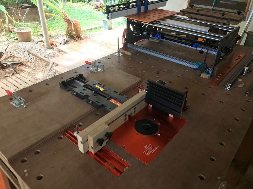 Bonjour Jambo, compte-tenu que la porte était ouverte je me suis permis de glisser un oeil dans ton atelier.Jambo a écrit : ↑13 mars 2022, 15:18 ....La deuxième photo montre le gabarit INCRA original. Je l'utilise pour la production de queues droites et de queues d'arondes. J'aime beaucoup la précision du gabarit et je trouve qu'il fonctionne très bien. Le principal inconvénient est que le positionneur incrémental n'a qu'une capacité maximale de ~200mm. Cela limite donc son utilisation à des pièces relativement petites. Il manque aussi un système d'extraction de la poussière intégré.