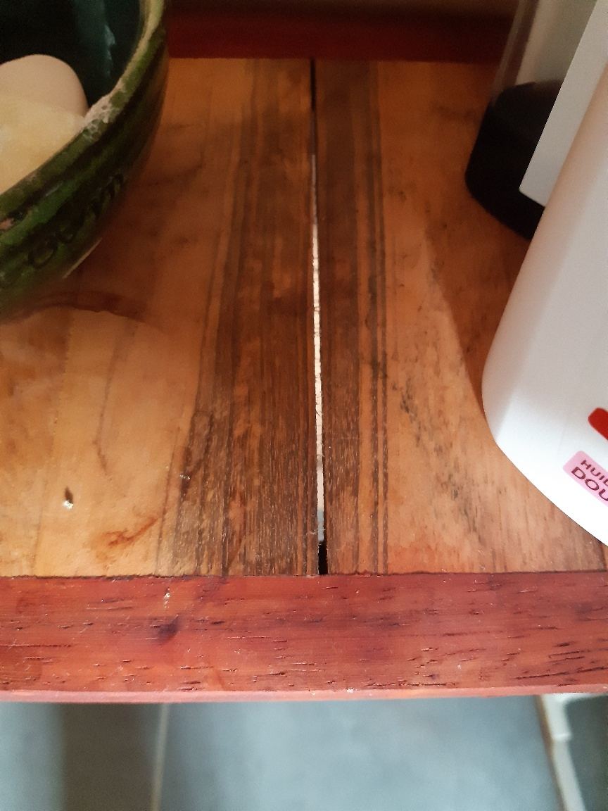ce n'est pas étonnant, ça cède ou ça retreint au plus faible , ça peut être aussi une planche qui fend. Là tu as la chance d'avoir un collage faible à un endroit. Mais ce n'est pas fini, ça peut encore travailler.