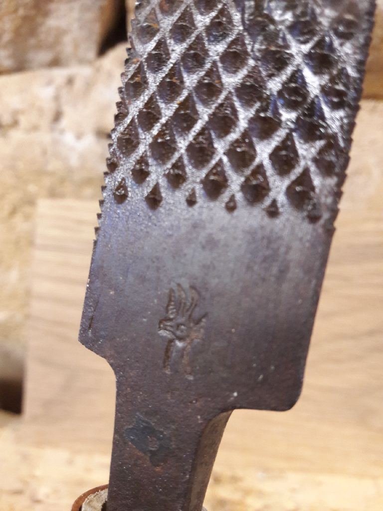Il y a quelques temps de cela, j'ai fait un tri dans les affaires de mon père. Et au milieu d'un fourbi peu intéressant, j'ai retrouvé quelques râpes de mauvaises qualités. L'une d'entre elles, pourtant, a attiré mon attention. Une grande râpe fauteuil de 30 cm de long avec l'inscription "Forge Saint-Juéry" garanti. De l'autre côté, comme le montre la photo, une tête d'animal. (Une chèvre ?). Il y a de grandes chances qu'elle ait appartenu jadis à feu mon grand-père, charpentier de son état.