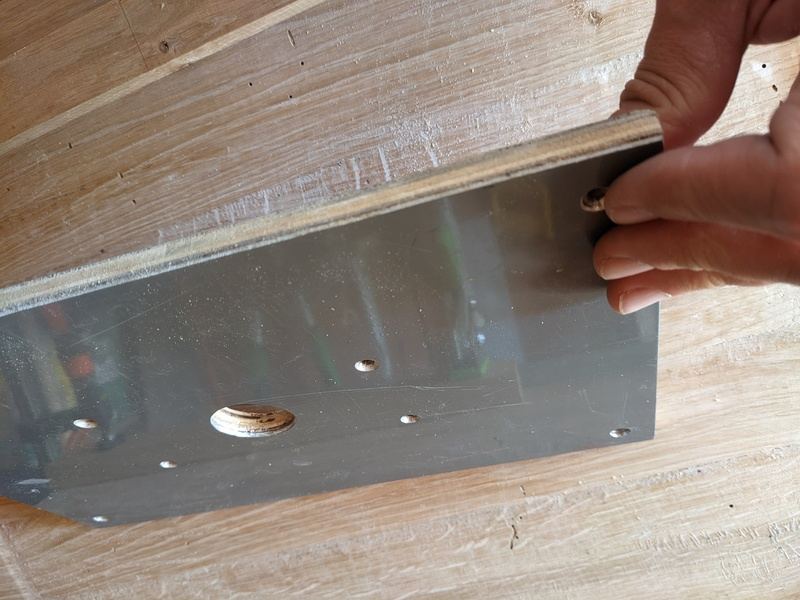 Une chute d'aluminium de 2mm découpée à la scie sauteuse, fini à la lime pour ébavurer. Une planche de contreplaqué de 8mm est grossièrement coupée à la dimension de l'insert en aluminium avec un peu de gras.