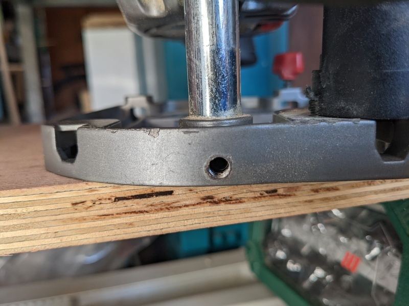 La semelle de la défonceuse est démontée pour pointer sur la planche en contreplaqué les quatre trous pour mettre les vis pour tenir la défonceuse. Perçage, vissage de la défonceuse pour vérifier que ça tombe en face. J'en profite pour monter une fraise pour faire la lumière de la défonceuse. Cette lumière sera agrandie par la suite.