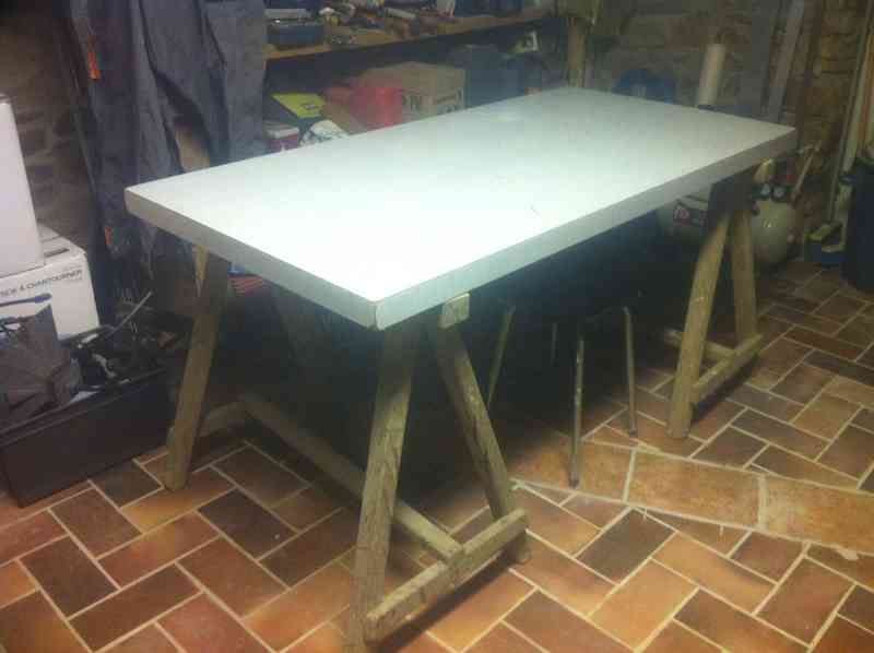 Le voisin de mon père m'a donné ce plateau en formica. 150cm par 75cm, plateau de 2cm avec rebord de 5cm.