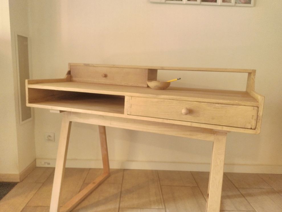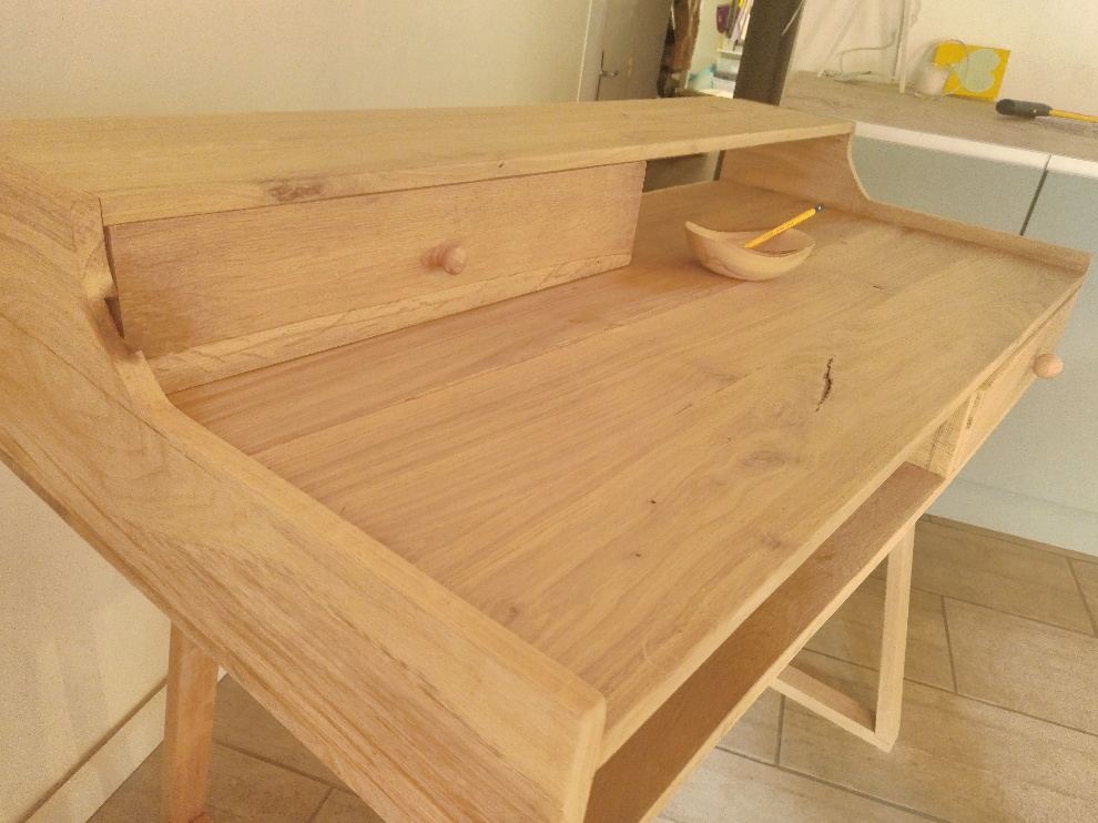 Ponçage finition vernis anova bois transparent egrainage et voilà pour le premier bureau .