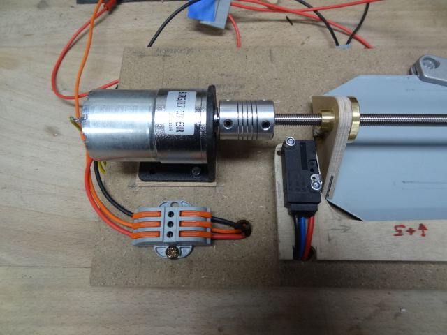 J'ai remplacé, pour le test, le moteur par un mouvement manuel de la guillotine et l'asservissement piloté par la mise en marche d'une machine (déjà opérationnel) par un contact sec que je bascule manuellement.