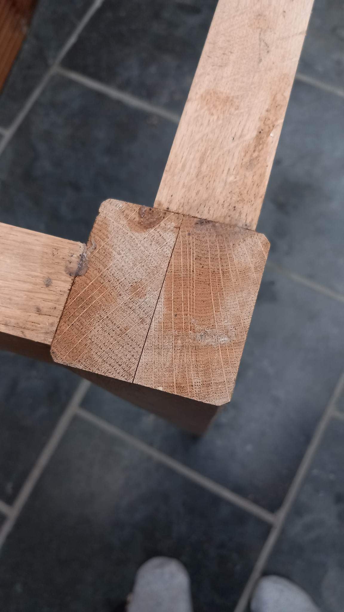 Je ne sais pas si c'est du à des tenon trop ajustés, ou bien si la température était trop basse lors du collage des pieds (entre 10 et 15° en journée, et 3-6° la nuit, je me dis que ça a pu jouer)