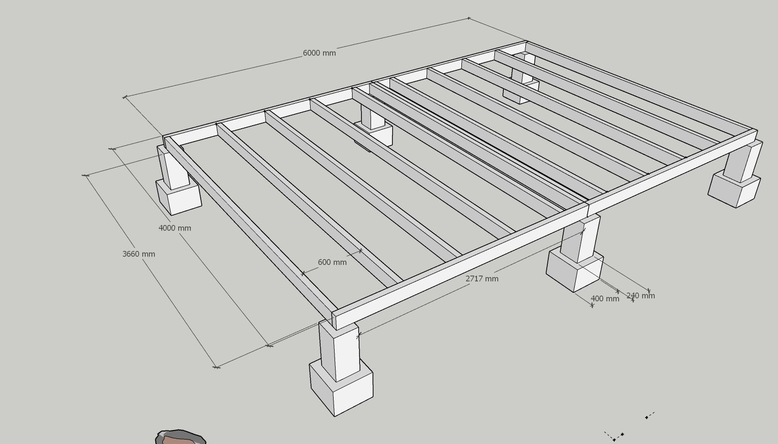 Mais globalement tu n'as aucun problème de trop longues portées puis que tu peux faire un ou deux plots béton dans le milieu de ta pièce qui vont supporter le plancher, étant donné que tu es parti dans cette technique qui est bien adaptée.