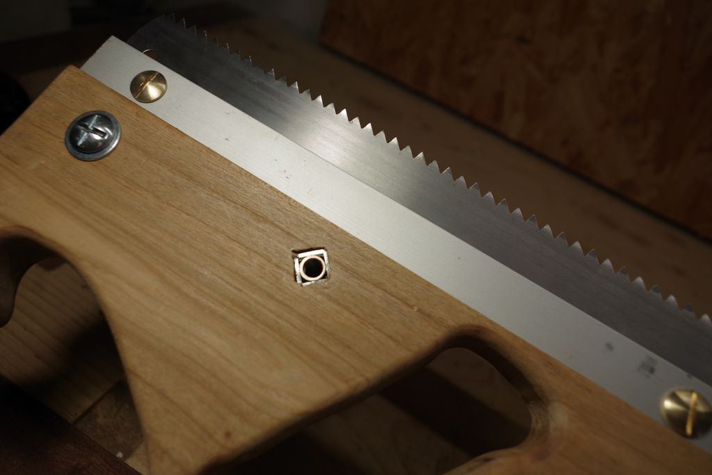 et démontée : On reconnait les ferrures de l'ancienne scie qui ont été repeintes, il reste encore les finitions, et bien sur l'affutage de la lame, mais après un rapide essais sur un petit morceau de bois, ça me semble prometteur.