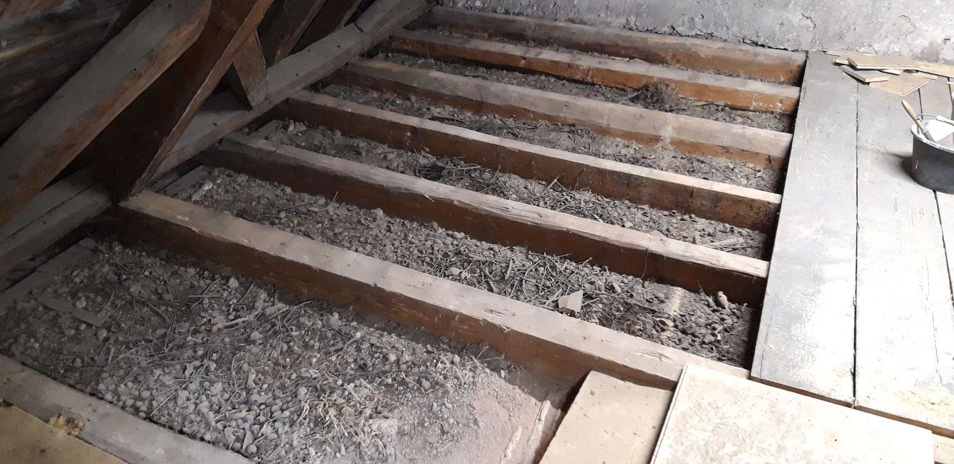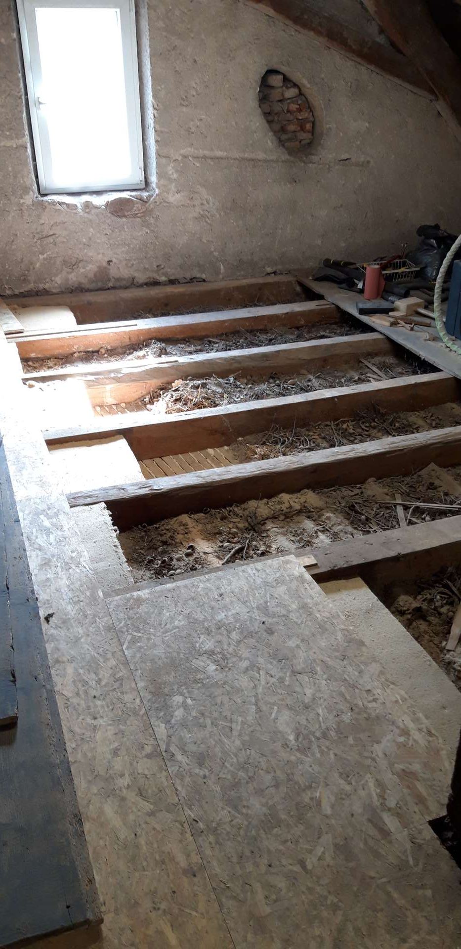 Actuellement j'isole les combles; enlèvement du vieux plancher, nettoyage d'années de poussières, noix et branchages, puis laine de bois en 145mm et plancher OSB 3 en 22mm: