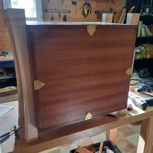 Après pas mal d'épluchage de pages Pinterest, j'ai fait un amalgame de plusieurs idées et ai abouti à ce design. Encore une fois c'est un mélange de Sycomore et de Sapelli. J'ai mis pas mal de temps à arriver sur cette forme, car j'avais du mal à me détacher d'un assemblage traditionnel, genre tenon/mortaise, entre les pieds et les caissons. D'accepter d'uniquement coller/visser les pieds, m'a permis de bien alléger la forme finale.