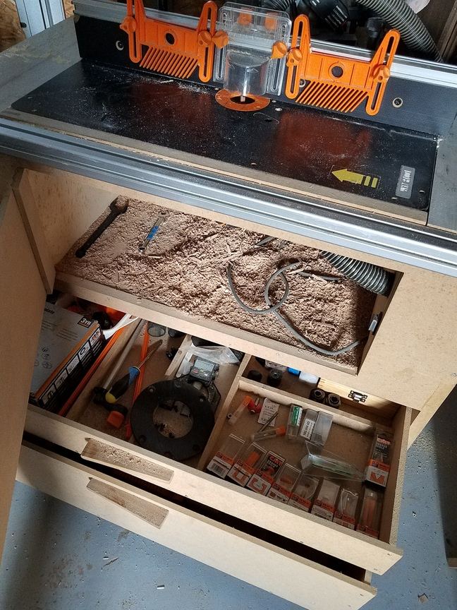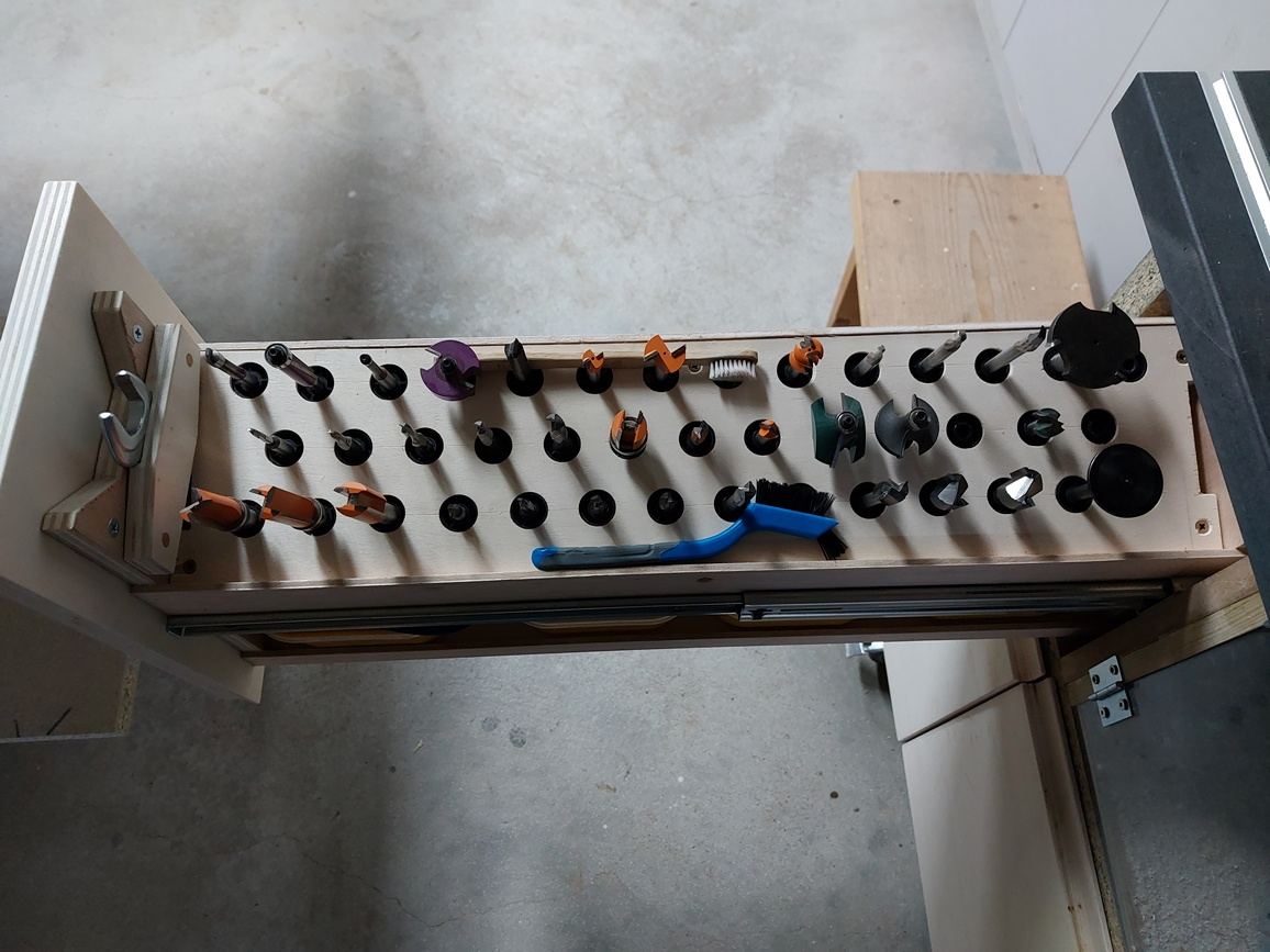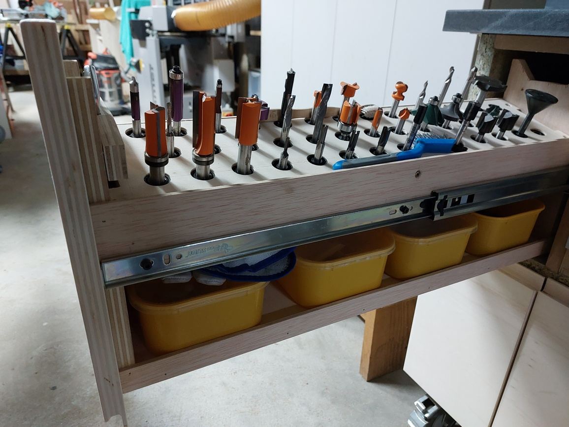 Je suis également de la team "boîtes CMT", rangées allongées dans un tiroir pas très profond, sous la table de défonceuse sous table, avec tous les accessoires qui vont avec. Je trouve celle que je cherche d'un coup d'oeil (car je n'en ai pas encore beaucoup...)