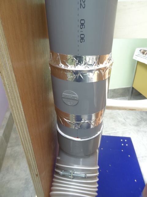 - la mise en place d'une coulisse ( la partie entre les scotchs alu qui permet de monter/ démonter simplement les tuyaux. L'ensemble sans la coulisse est un peu galère à monter vu la largeur qui est le mini de ce qu'il faut pour un coude à 90° ( 2x 45°), le tuyau droit et de nouveau un 90 dans l'autre sens