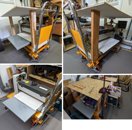 Un dernier point à améliorer est d'avoir une torsion box MFT pour poncer/assembler. Il était prévu de faire par dessus la calibreuse qui est sur un chariot relevable. Le problème est qu'au niveau du cahier des charges: