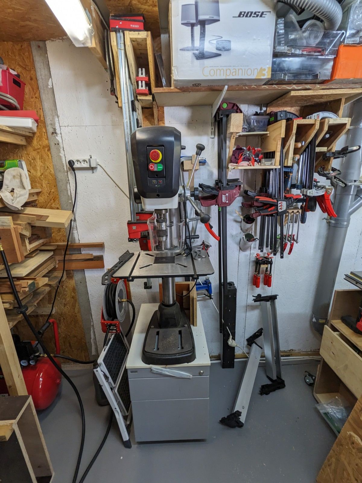 Détail2: étagère de coin et perceuse à colonne. Chouette perceuse à colonne, dont je me sers de plus en plus. Elle est assez facile à déplacer, et le changement de vitesse n'est pas si fastidieux une fois qu'on s'y fait. à noter qu'elle est potentiellement à la même hauteur que la scie à rubant si j'ai besoin de maintenir de grandes pieces et que j'ai la flemme de sortir des tretaux/servantes. Autour de la scie : des serres joints qui sont là pour l'instant, mais qui pourraient bouger (l'etagere dans le coin était au dessus de la tondeuse, elle est eventuellement appelée à disparaitre. Par contre j'ai mis le compresseur dessous, et c'est pratique qu'il soit en face de la porte au cas ou j'ai beson de clouer, ou souffletter dehors.