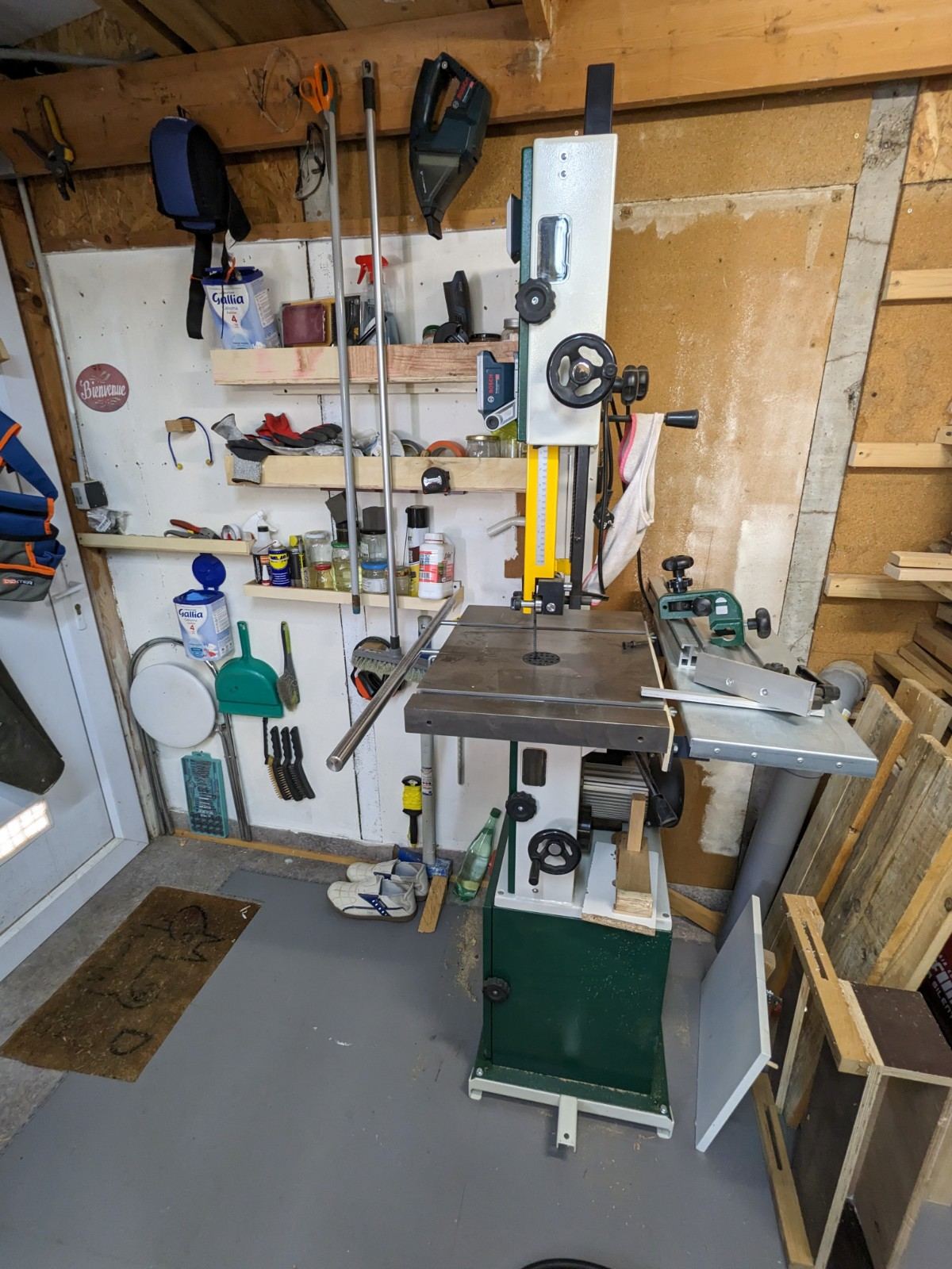 Détail1: La scie à ruban (sabre 350, très content de mon achat, j'ai refendu sur 27 cm de hauteur, ca passe, par contre faut que je me lance à le faire sans guide, il y a toujours un moment ou ca derive). La scie est tout de suite dans l'entrée, ca permet de decouper facilement des planches jusqu'à 1m50, ou alors de sortir la scie pour les travaux en série. Maintenant que j'ai fait de la place, je peux la bouger ou je veux dans l'atelir (surtout en poussant les autres outils, car la scie est sur 2 roues et se manipule avec un timon, ce qui necessite pas mal de place pour les manoeuvres). J'ai fixé une table de sortie récupérée sur la calibreuse. ça sert surtout de table à bordel... Sinon, sur le mur à gauche de la scie, des boitageres: le fait d'avoir un rebord devant permet, pour des etageres étroites, de ne pas tout faire tomber lorsqu'on rentre des trucs encombrants dans l'atelier. faut juste pas mettre des trucs petits au risque de les chercher un moment... Je met aussi un tas de trucs fixés aux murs, ca me permet de me rappelé que je les ai, les trucs les moins utiles sont le plus loin, et si je suis pas content, je le change de place rapidement.