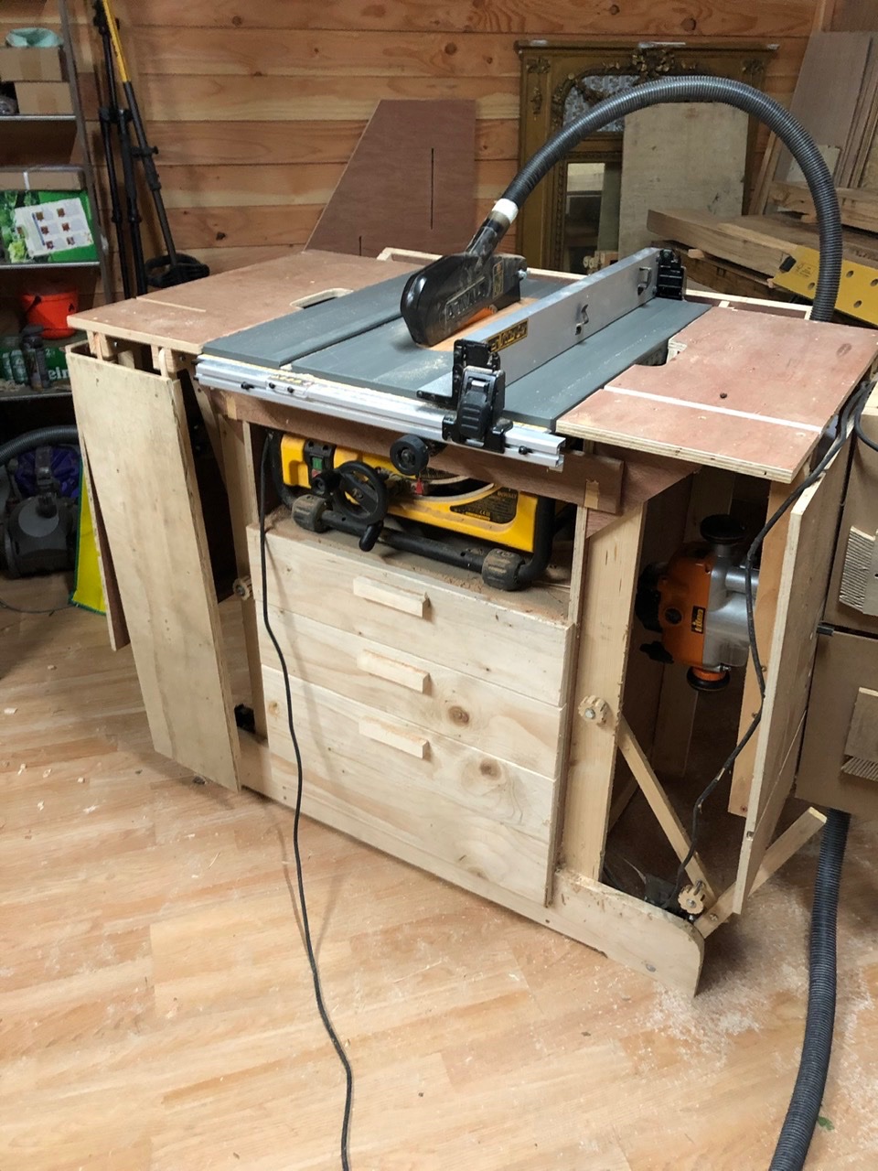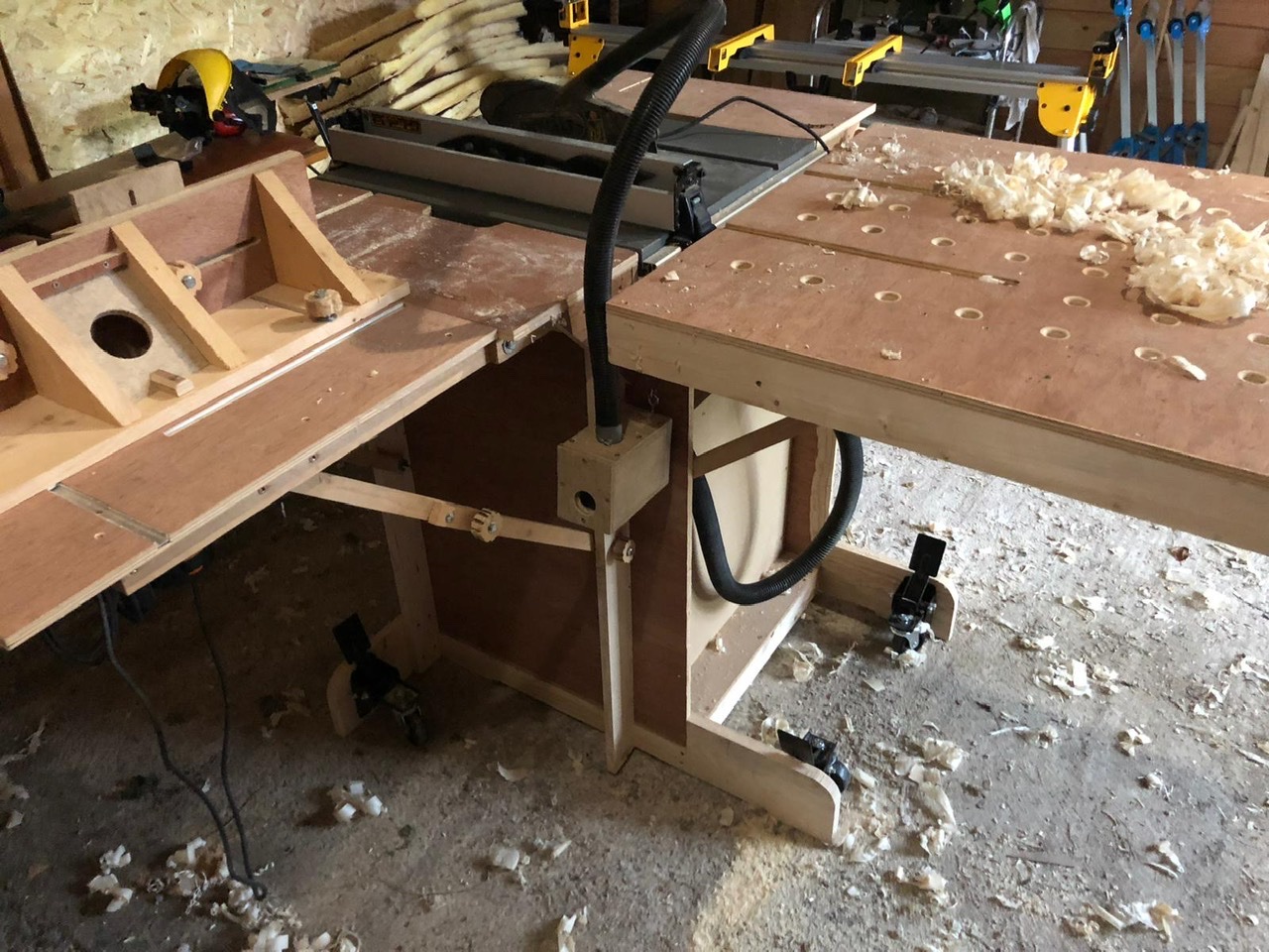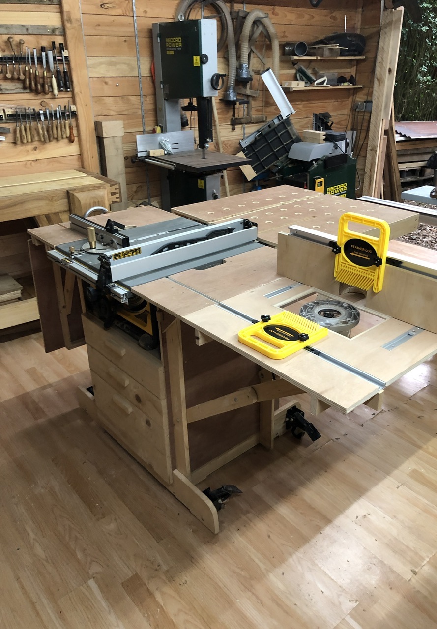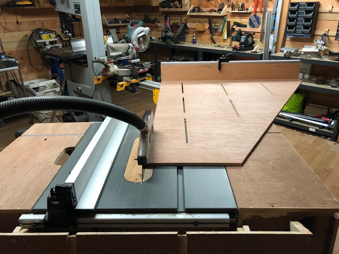 Mise à jour du sujet car je viens de refaire la partie défonceuse sous table du module. Je voulais que la défonceuse soit accessible sans avoir à dévisser tout plein de vis, remplacer les rails de recup’ qui étaient de simples « U » par des rails t-track pour pouvoir recevoir mon guide perpendiculaire et enfin refaire le guide parallèle pour que lui aussi coulisse sur des rails avec au passage plus de recule possible.