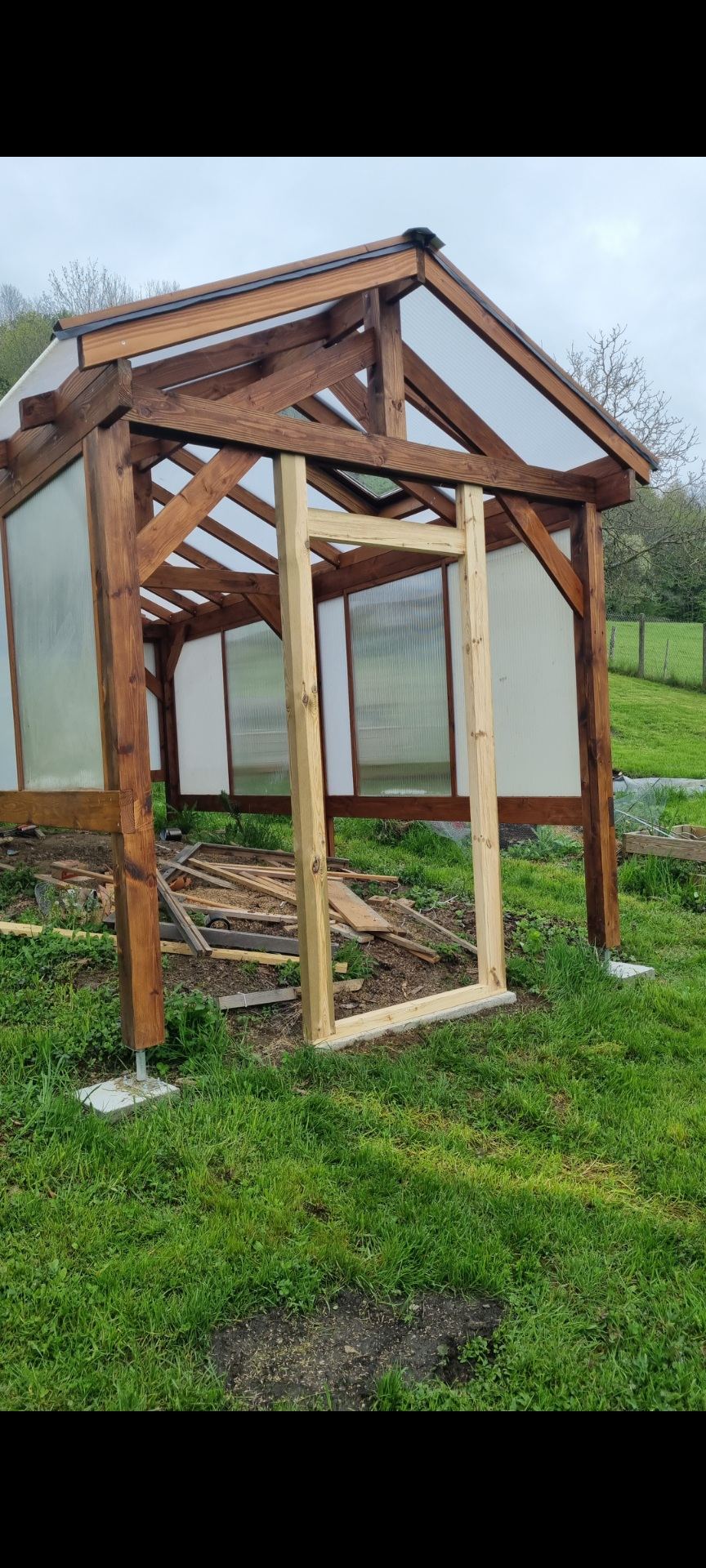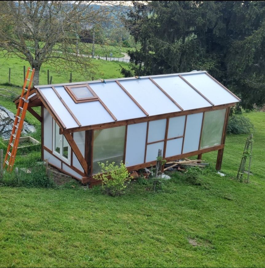 Une serre en Douglas et pin, des heures de rabotage de bois bien tordu qui traînaient au boulot. Un bon coup pour le polycarbonates sur le bon coin et voilà. A nous les tomates !