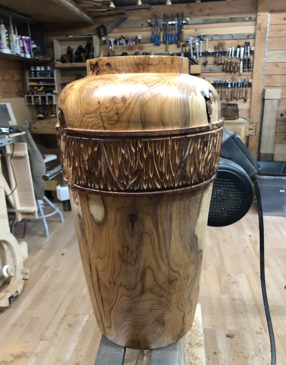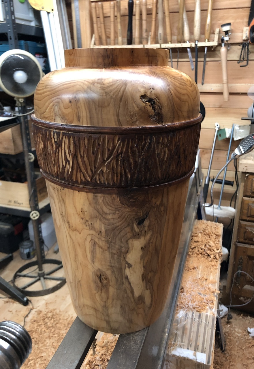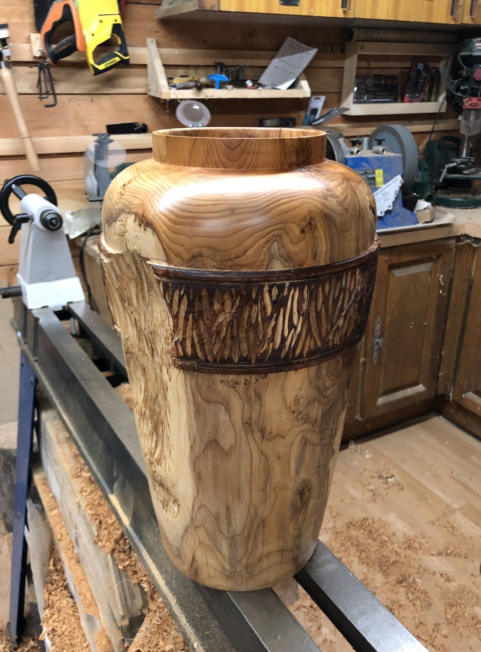 Voici un vase tourné à partir d’une belle section d’if qui m’avait été offerte. Après l’épisode de casse de mon porte outils en début du cylindrage de cette pièce, j’ai commandé et reçu un nouveau porte outils et pu poursuivre le tournage.