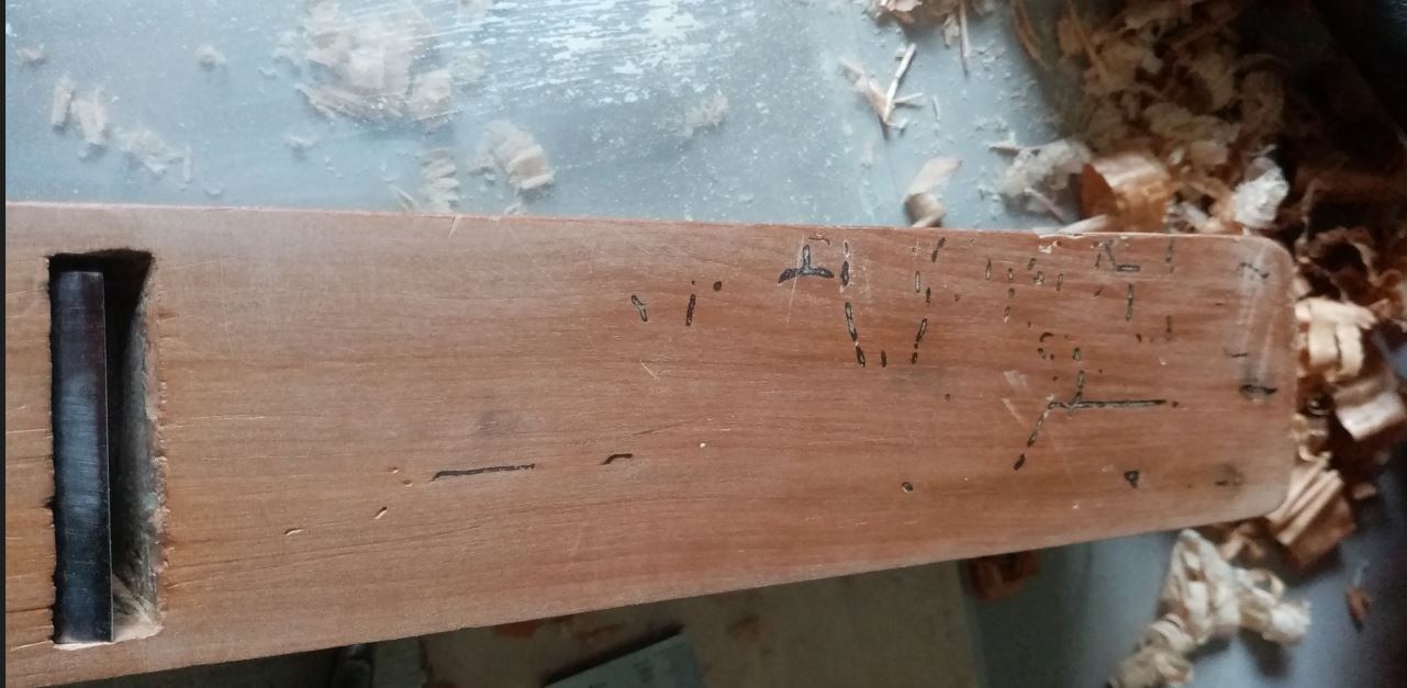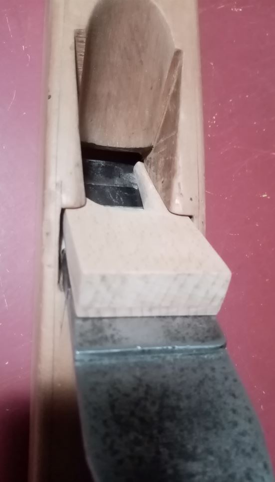 et après utilisation de Losung , c'est mieux (mais je m'attendais à beaucoup mieux sur la teinte ; pas facile de doser ce Losung pour de petites quantités, et le mélange sèche très, très vite) puis le remplacement du coin qui manquait un peu d'épaisseur , et de plus la pente d'appui dans l'embouchure n'est pas bien rectiligne...le résultat pourrait sûrement être meilleur, mais pour une première c'est correct, d'autan que le serrage du contre-fer est meilleur, donc plus facile de garder un bon réglage du fer...