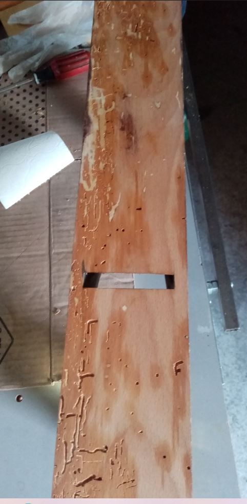 l'un des pires, cette fameuse demi-varlope, sur la photo ci-dessous, c'était après avoir retrouvé la planéité , et traitement préventif, et nettoyage des trous restants , avant rebouchage au Losung (la teinte qui n'est pas très identique, est dûe à mon avis au fait que la récupération de la poussière de ponçage contient trop d'impuretés) et après re-ponçage au 120 et 180