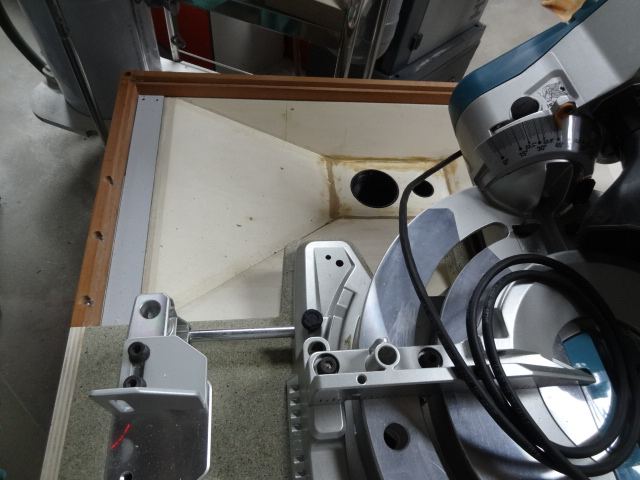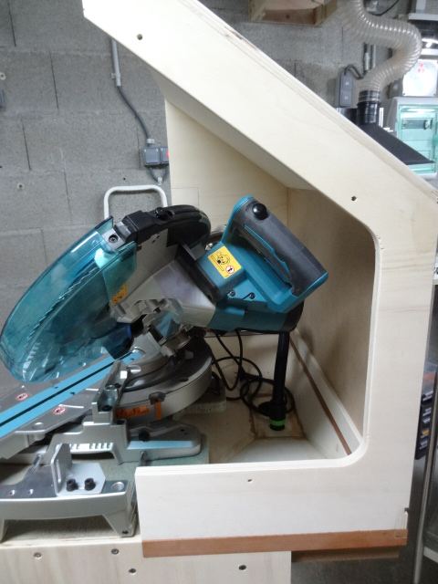 Donc les biseaux varient de 48°G à 48°D et les onglets de 60°G à 60°D, même s'il est vrai que 80% des coupes sont droites.Je voulais conserver l'aspect pratique de ce type de scie et pas être ennuyé par la hotte y compris lors de sciage d'onglet ou de biseaux.