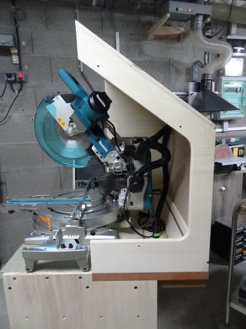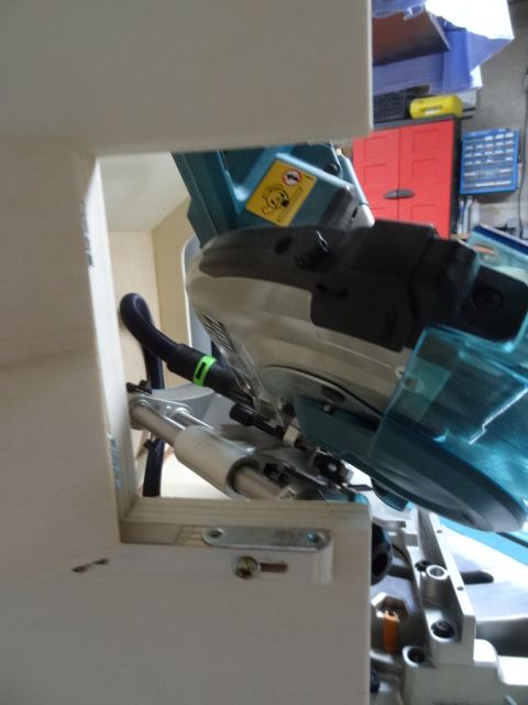 Je voulais conserver l'aspect pratique de ce type de scie et pas être ennuyé par la hotte y compris lors de sciage d'onglet ou de biseaux.