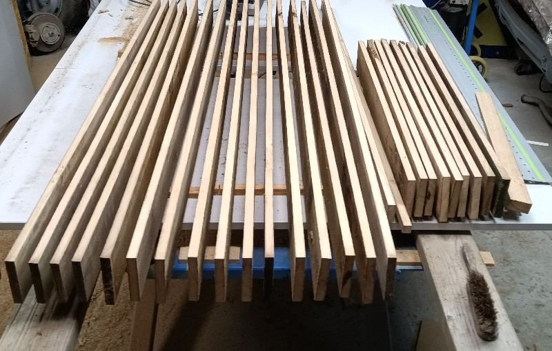 tu devrais tronçonner aux longueurs de tes traverses et montant (+marge) avant de tracer ton long trait au cordeau. Ainsi tu pourra mieux éviter les craques et moins gaspiller.
