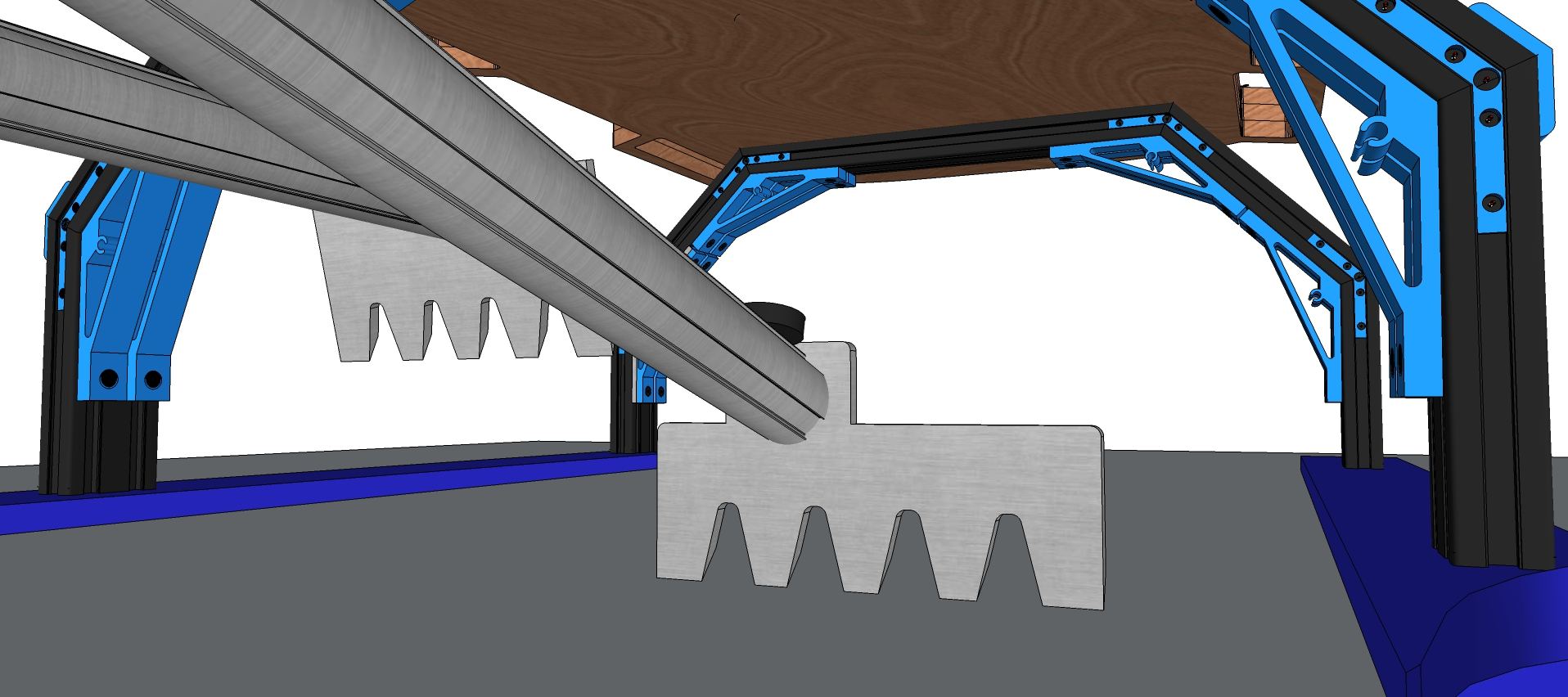 Pour l'inclinaison du tube inférieur: les leviers sont faits avec des profilés rond D28 Bosch Rexroth EcoShape . Les seuls coudes fixes existants sont à 90°. Il existe des articulations réglables entre 90 et 270° par pas de 15°, mais pas facile à trouver.