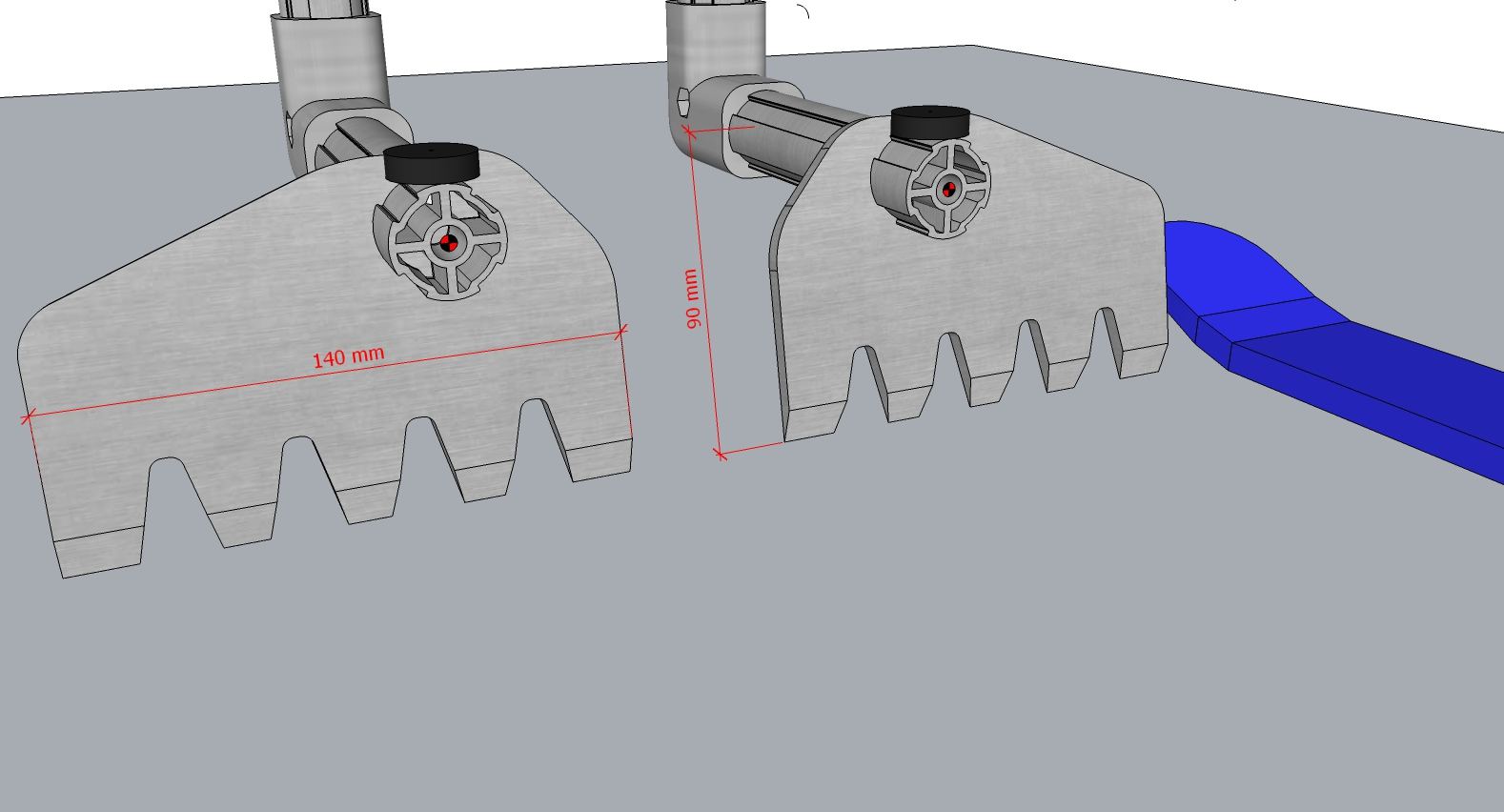 J'ai refait des mesures, et des plans. Je suis parti sur des pelles toutes simples, sans pliure. Les dents sont trapézoïdales, un peu plus hautes qu'avant (2,5 cm au lieu de 1,5).