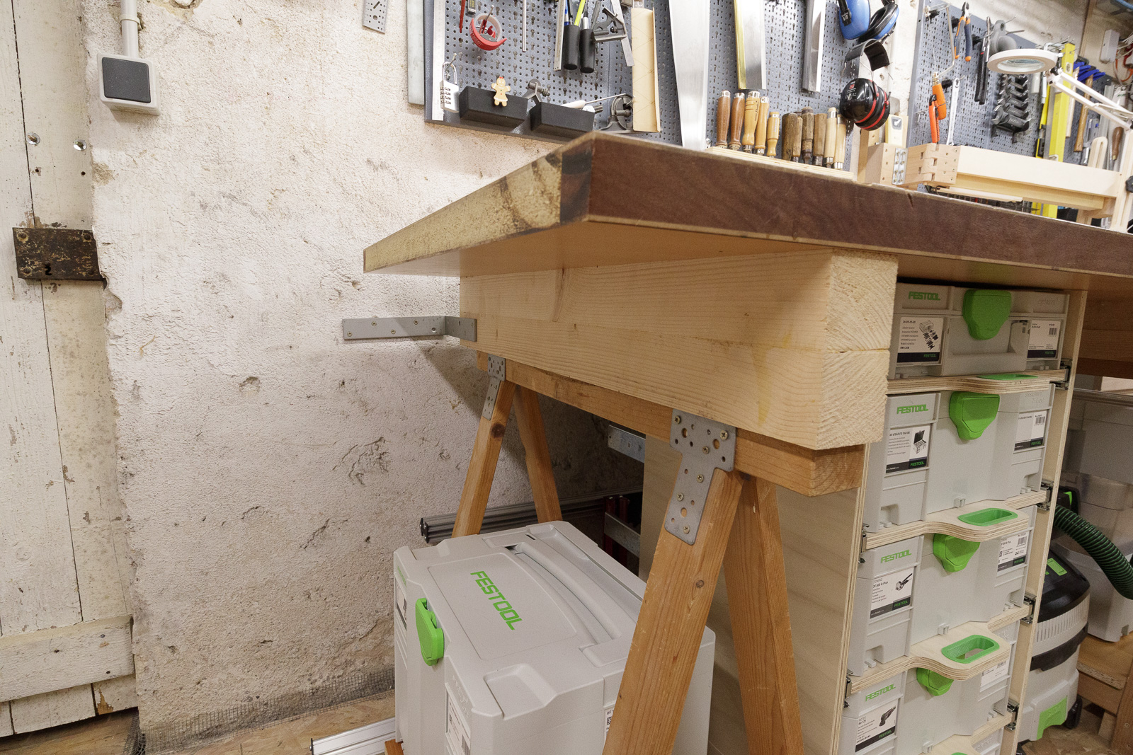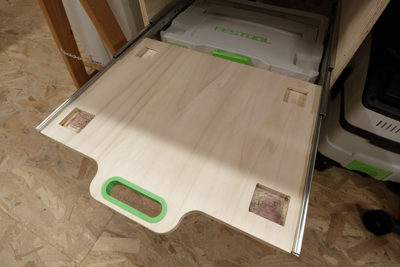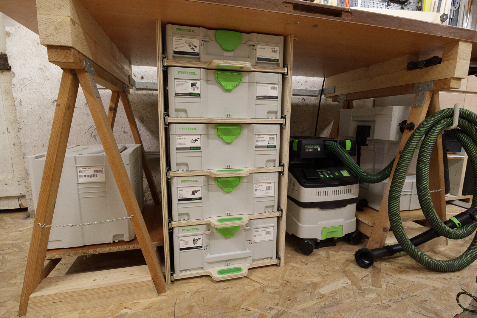 Bien que les systainers ne fassent que 30 cm de profondeur, j'ai installé des coulisses de 550mm. Ainsi les boîtes sont suffisamment reculées sous l'établi pour éviter de buter dedans lorsque je travaille, tout en permettant un accès aisé au contenu :