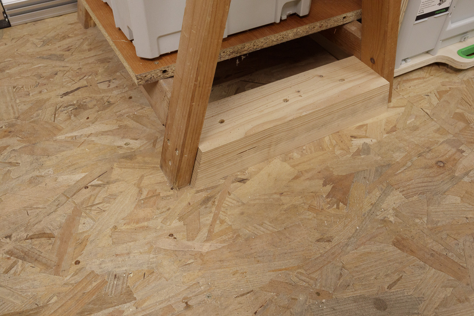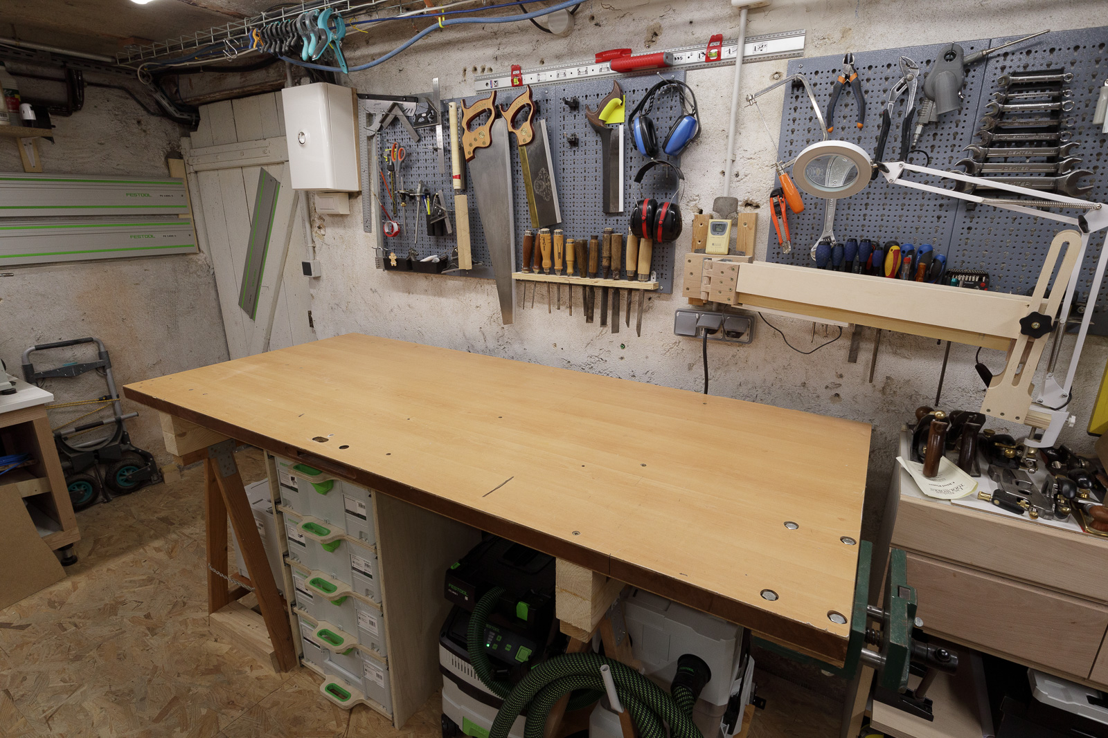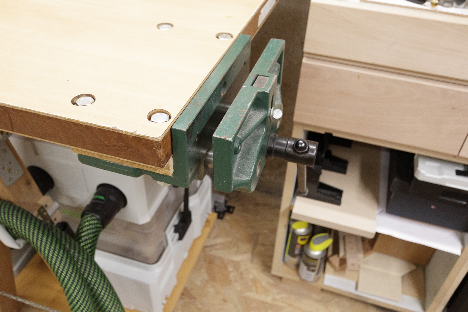 Bien que les systainers ne fassent que 30 cm de profondeur, j'ai installé des coulisses de 550mm. Ainsi les boîtes sont suffisamment reculées sous l'établi pour éviter de buter dedans lorsque je travaille, tout en permettant un accès aisé au contenu :