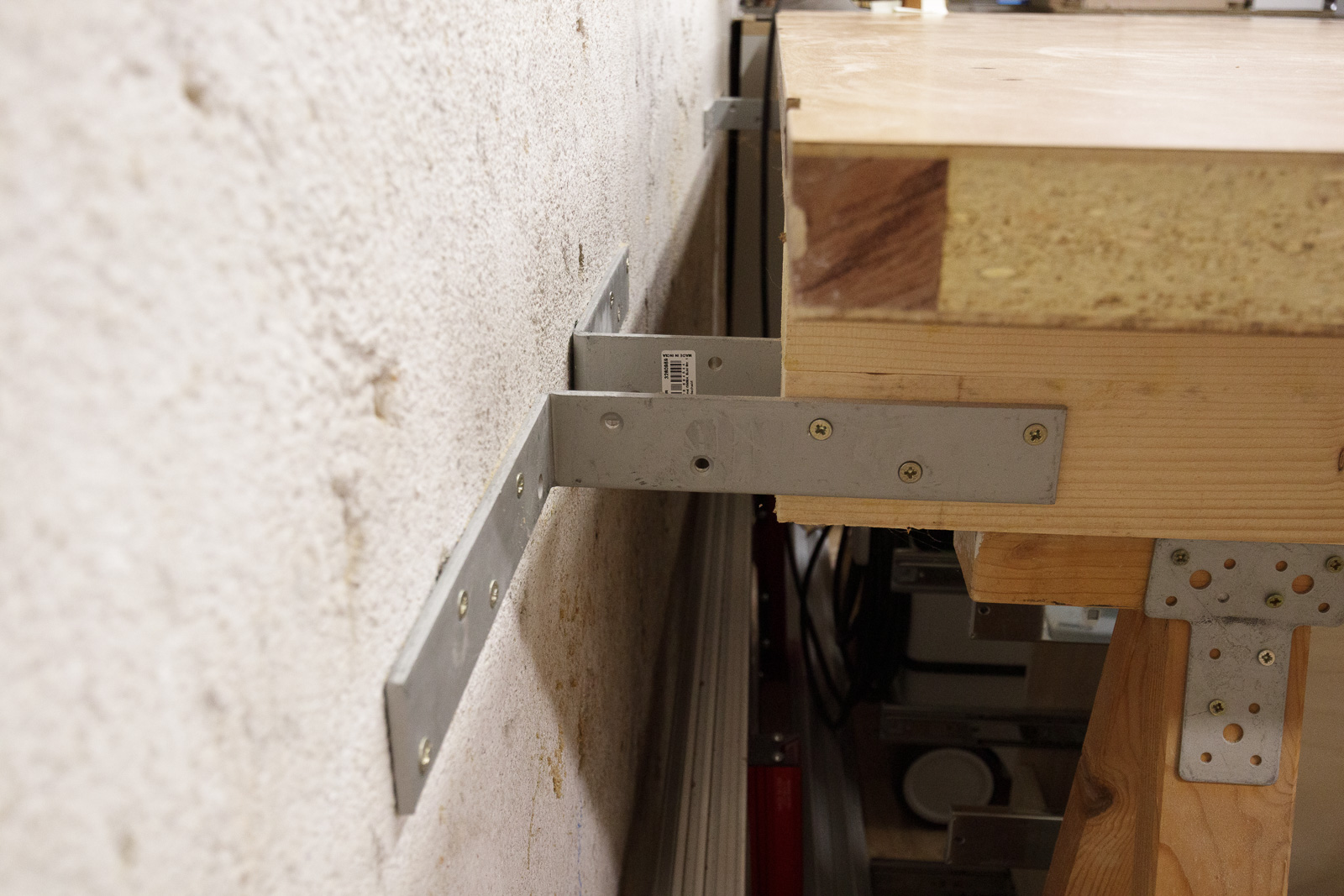 Et enfin, les madriers sont solidarisés au mur par des équerres :
