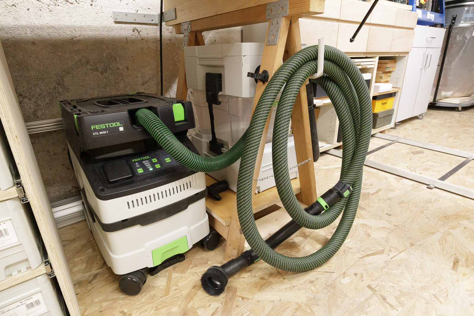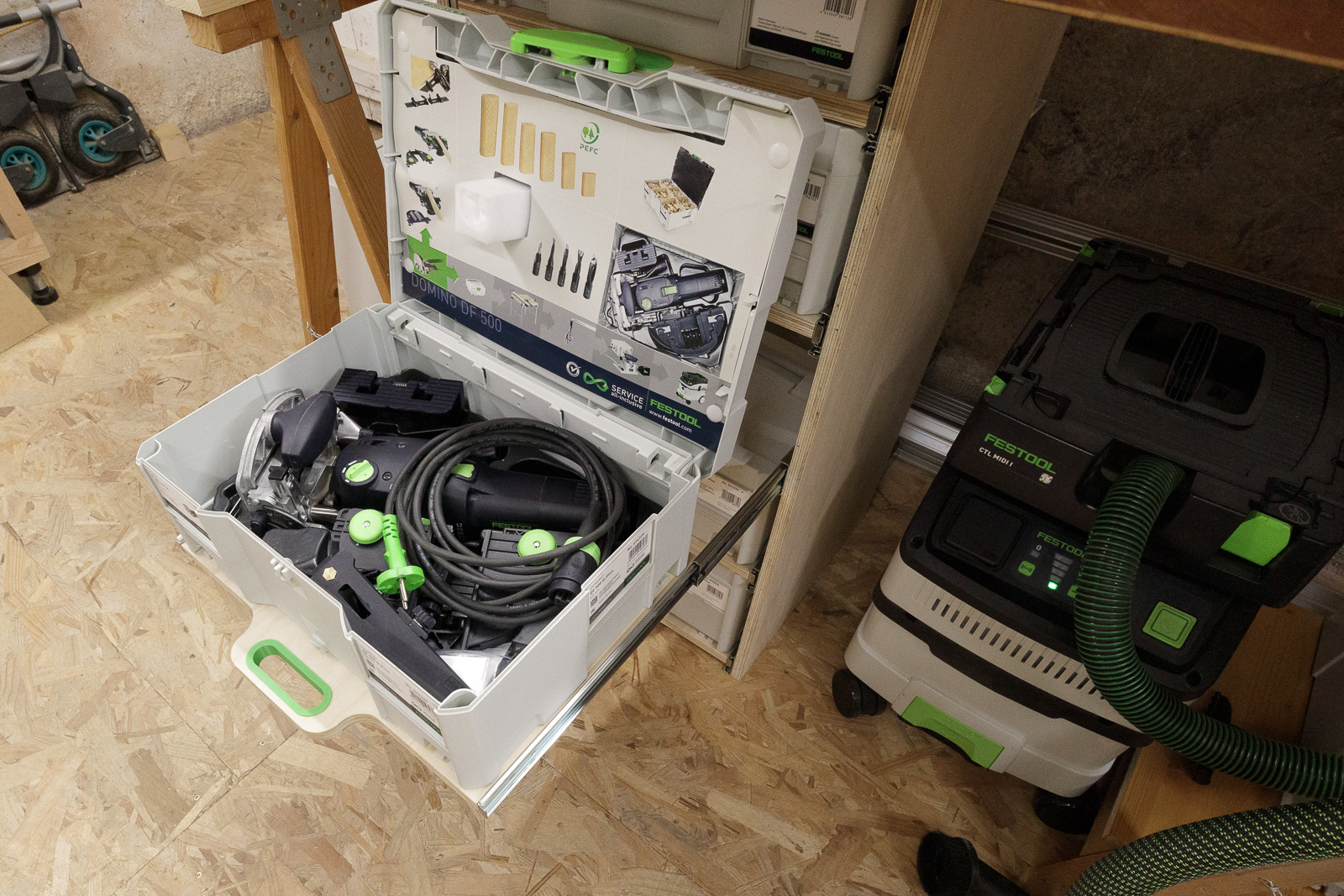 Un peu plus à gauche se trouve l'étagère à systainers que j'ai construite très récemment :