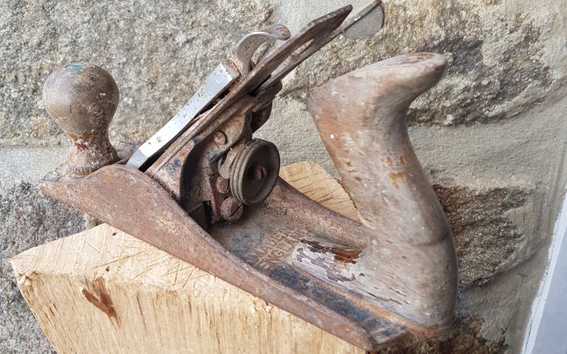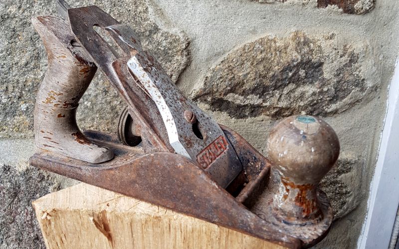 Et son prix attractif (2 €) en fait un bon candidat pour une remise en route... il a fallu bien chauffer pour défaire les vis, bien frotter la rouille, recoller la poignée cassée, bien les travailler ensuite (poncées, teintées (chêne clair) et cire). Puis mise en peinture du corps, affûtage du fer et voici le résultat :