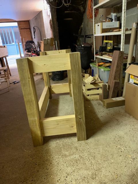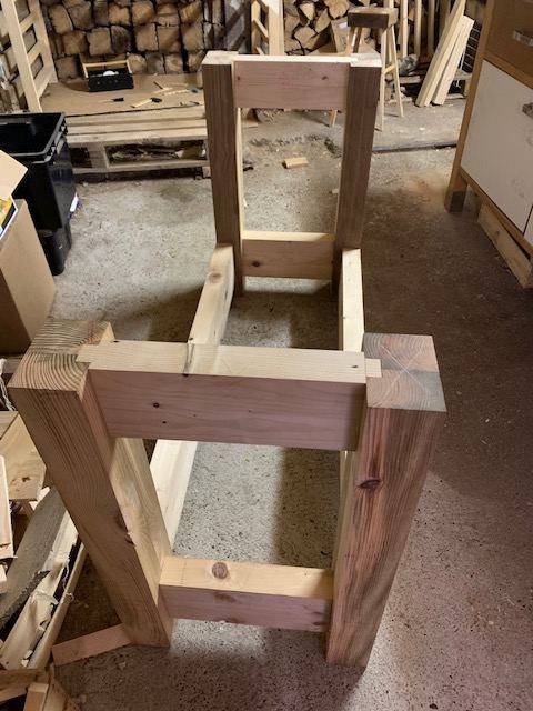 Bon, j'ai fait le premier montage à blanc du piètement. Pas de grosse bêtise pour l'instant... touchons du bois.