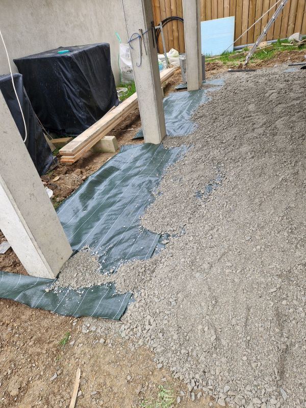 J'ai commencé par mettre à niveau la zone sous l'extension: une couche de tout venant pour égaliser le sol puis la pose d'un film de paillage pour le recouvrir en partie haute de 5 cm de tout venant, puis de niveau sur l'ensemble. 20 cm de pente. J'ai loué une plaque pour compacter et je ferai les bords extérieurs avec un béton maigre. Ainsi j'aurais une belle plate forme en attendant le béton lavé ou taloché. J'attends encore des propos, pourquoi un film de paillage: le géotextile est fait pour séparer les boues du remblai, moi je veux pour le moment empêcher les herbes de pousser