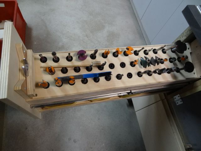 Le coffret de commande, les tournevis nécessaires, un support très visible rainuré recevant les fraises pour éviter qu'elles ne roulent et les retrouver facilement. Bougrement pratique, j'en ai également un à coté de la perceuse pour les forets.