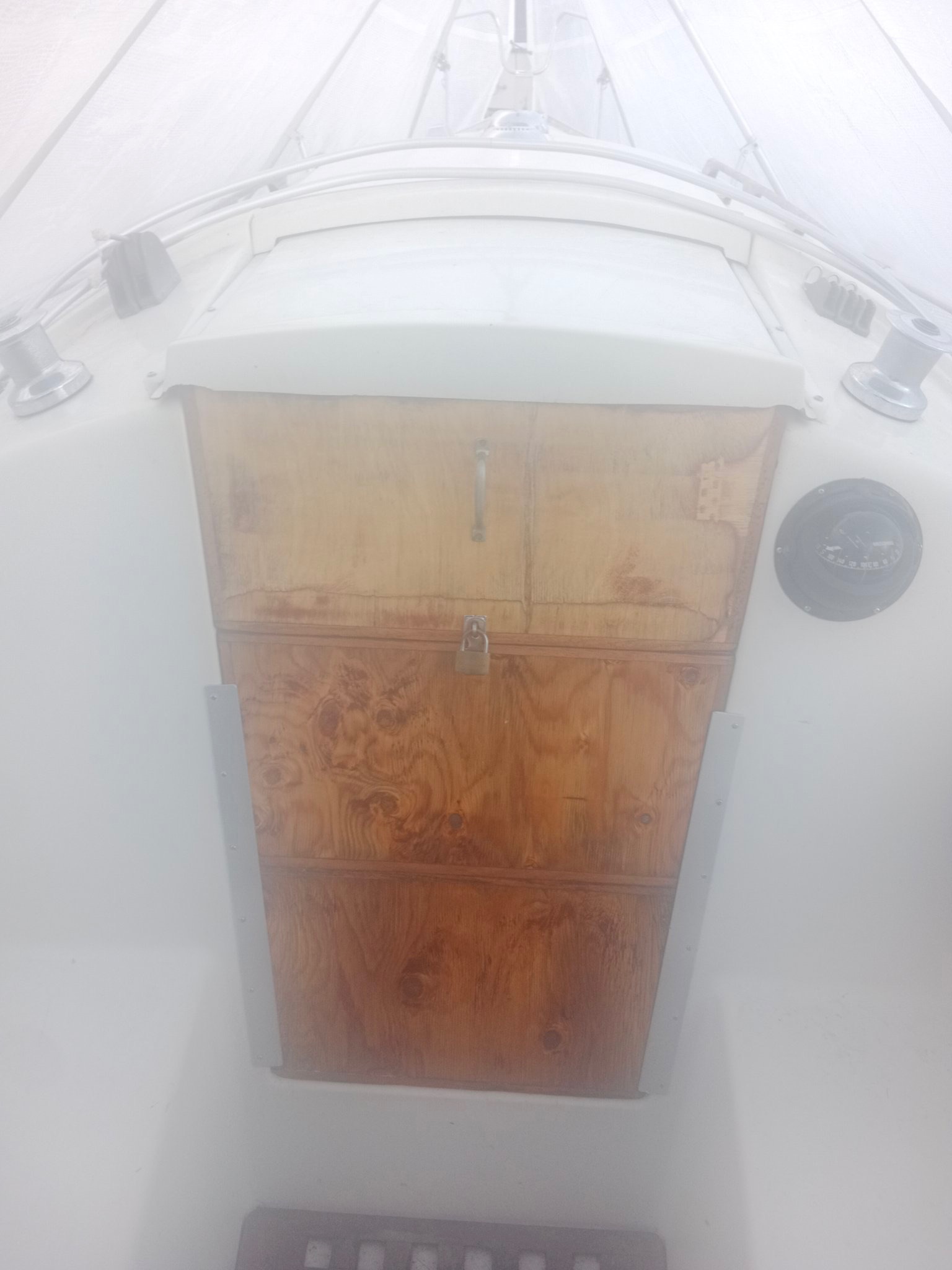 Charnière sur une entrée de voilier c'est peu courant. On préfère des panneaux qu'on range et qui dégagent le passage en navigation (ou même au port quand on y est - hier j'ai bricolé sur le mien et j'ai bien du passer dan s l'entrée une cinquantaine de fois...)