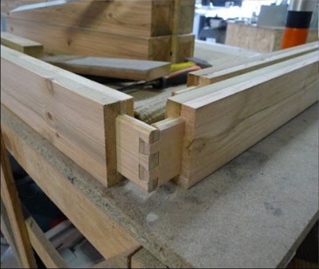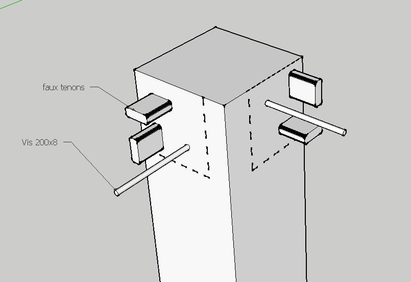 deux faux tenons et une vis de 200x8 pour chaque assemblage, le tout collé à la PU. Un petit coup de mèche à bouchonner coté extérieur.