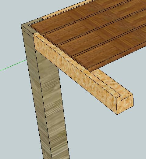 Autre idée, pourquoi ne amener les pieds à hauteur du plateau... le cadre se transforme en traverse et une rainure dans le haut des pieds et des traverses permet de mettre le cumaru à niveau....