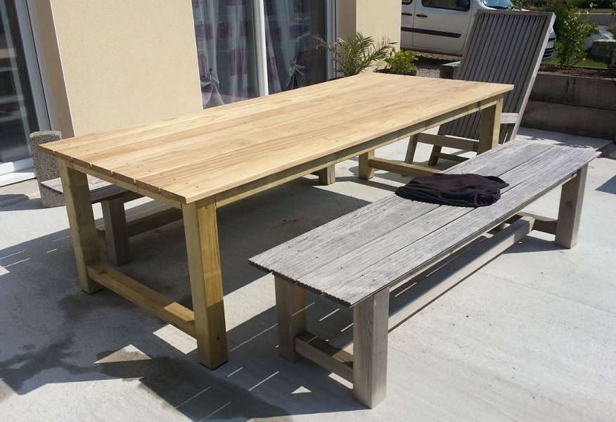 Pour un banc ça passe, mais la faible épaisseur des lames de terrasse, ne colle pas avec l'utilisation en plateau sur une table.