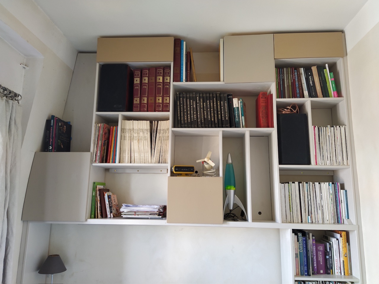 Pour ne pas que ça cintre à cause de la charge (et au départ j’avais dis à la personne « faudra pas trop charger hein, des ptits trucs de déco » ce à quoi elle m’avait répondu « oui oui bien sûr »…) il y a des tasseaux chevillés au mur sous presque chaque tablette horizontale. Et aussi 3 gros tasseaux verticaux pour soulager l’ensemble.