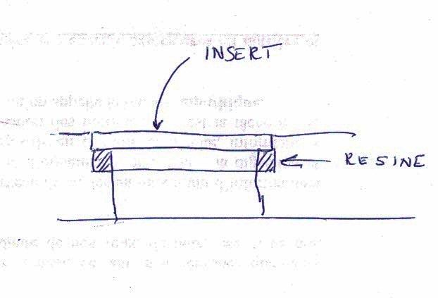 - la rehausse usinée pour recevoir l'insert, mais dans ce cas l'appui sur le mélaminé n'est pas top et risque de se détruire rapidement. Tu peux peut être le renforcer en mettant 3 ou 4 mm de résine époxy et en l'usinant à la défonceuse. Ou alors utiliser un matériau comme le compact la place du mélaminé.
