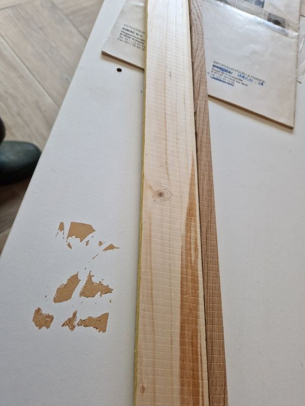 1 photo avec fer sorti de 1.5 mm env, un carrelet et une latte. C'est pas facile sur le cylindre de prendre une cote précise au 1/10. Par contre suis bloqué avec ce réglage sur la dégau ; cela frotte un peu sur la lèvre alu de la table de sortie.