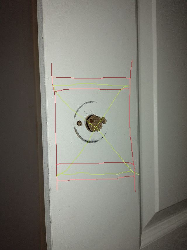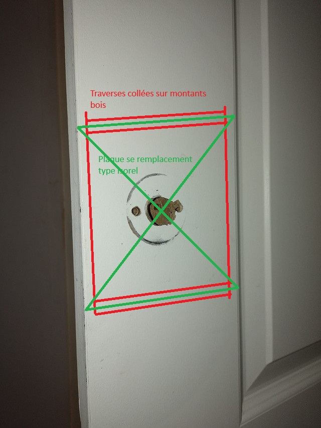 Voilà ma solution en photo. Les traits sont olé mais l'idée est là. Deux traverses au delà de l'emprise de la serrure qui rejoignent les montants bois et on rebouche avec le même matériau qui doit être de l'isorel pour ouvrir de nouveau pour poser les éléments. Les traverses sont collées et à cheval sur la pièce d'apport.