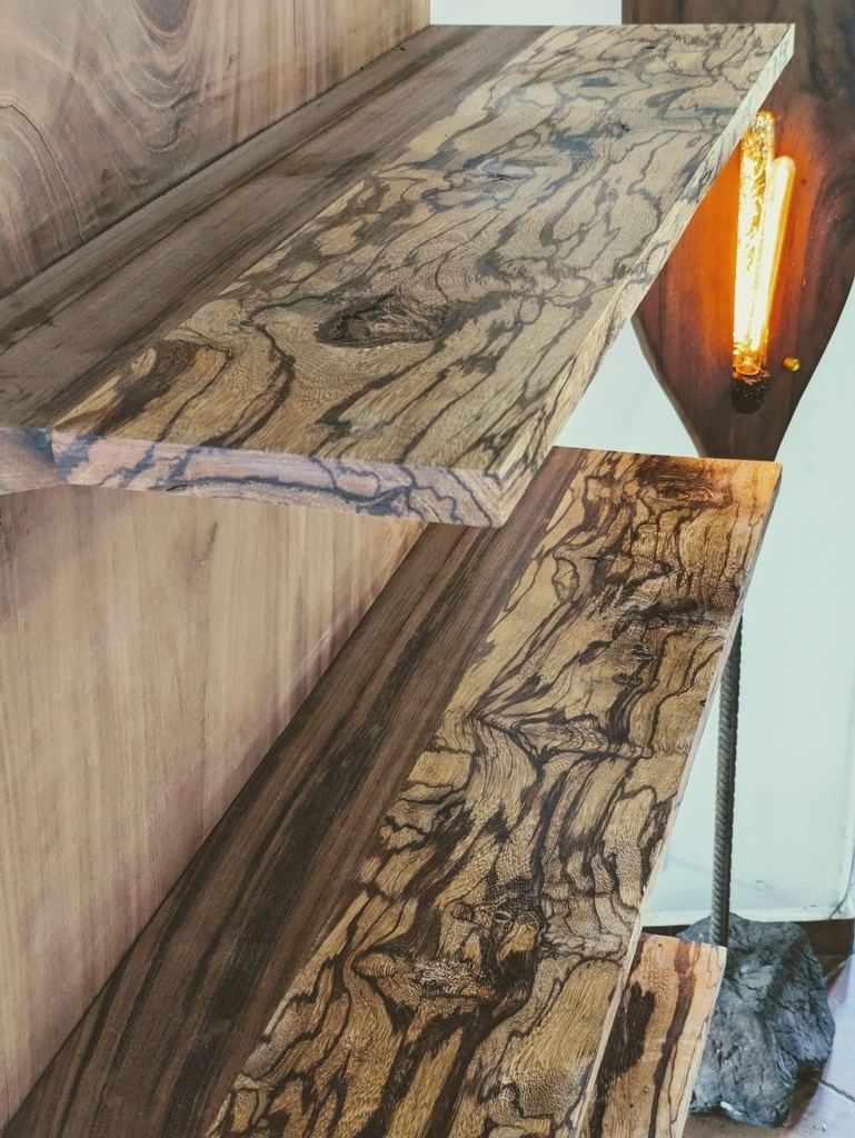 9 étagères de 1.10m à 0.94m en 0.30m Bois serpent & Muiriacatiara 9kg/étagère nue