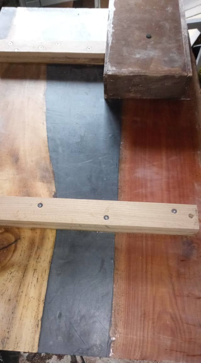 2 renforts en chene massif de 35mm d’épaisseur, seront fixer dessous et recevrons les pieds en metal ( fabriquer par un artisan)