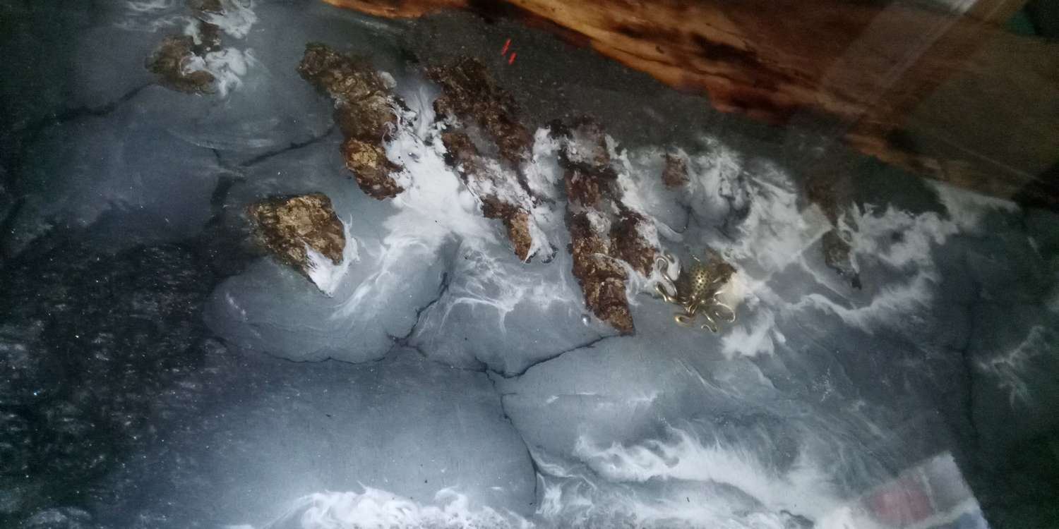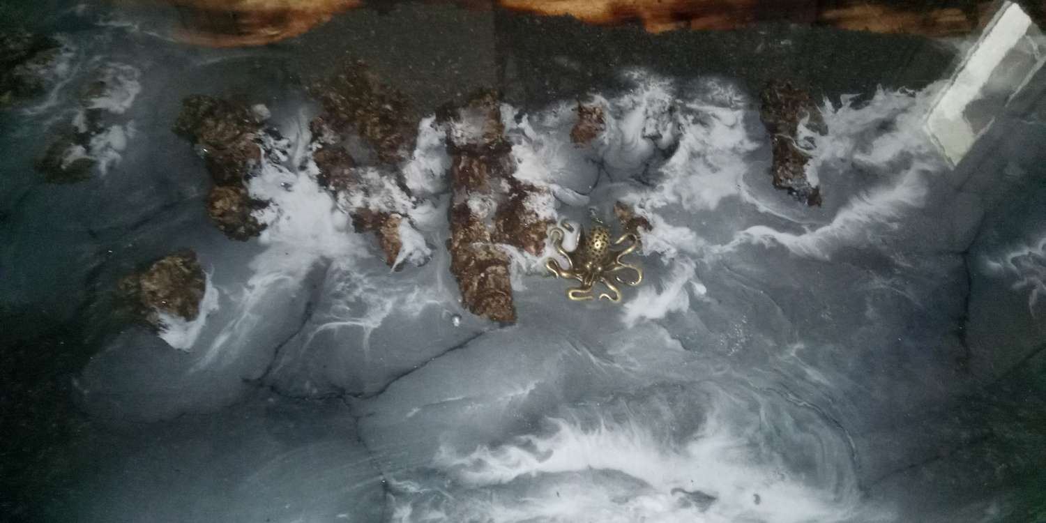 la table basse fera 37/38mm d'ep, la pieuvre en métal faisant 23 mm de haut, entre le fond transparent, fond de couleur, la déco... et avoir 8 mm au dessus en epoxy de la tete de la pieuvre... le calage été tendu.